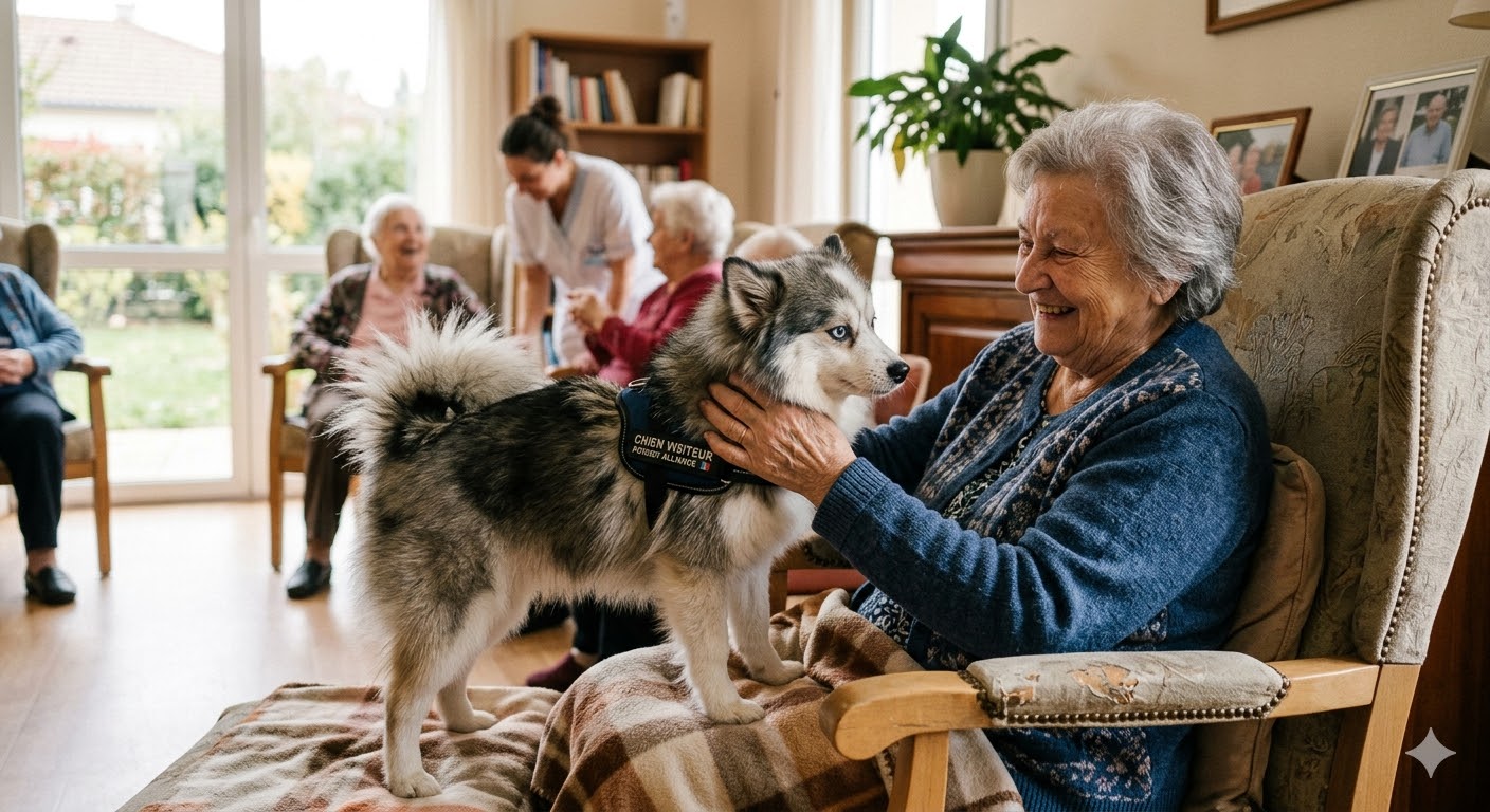 A ne pas confondre avec le Chien Médiateur, on retrouve néanmoins les mêmes critères de sélection du chien pour qu’il puisse être visiteur : en effet, le Pomsky doit être sociable, obéissant, avoir une vraie relation humaine, flexible dans son adaptation en fonction des situations, ni agressif ni peureux, bien dans sa tête, épanoui …